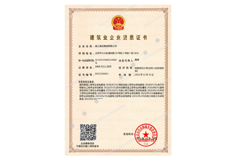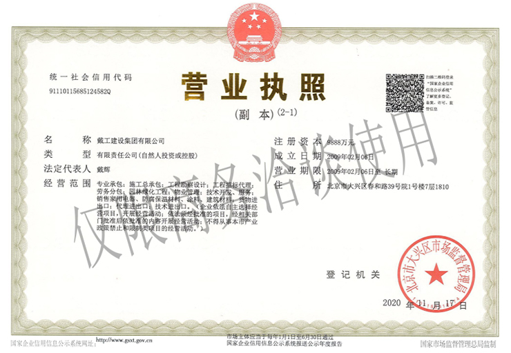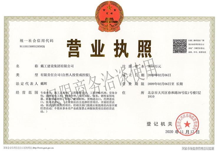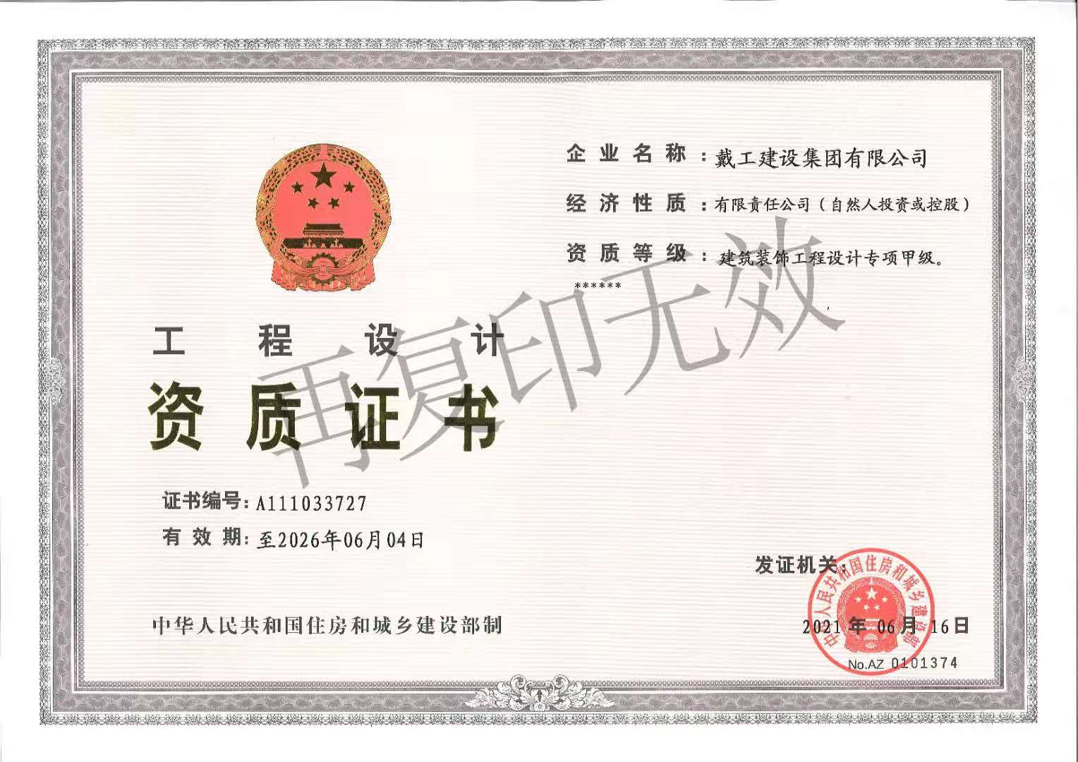戴工建設集團有限公司,創建于2009年,注冊資本9888萬元人民幣。公司位于北京市大興區。具有建委頒發的建筑裝飾裝修專業壹級,防水保溫工程專業壹級,建筑幕墻專業貳級,消防設施專業貳級,電子與智能化專業貳級,特種工程(結構補強)專業不分等級,建筑機電安裝專業貳級,環保工程專業貳級,鋼結構專業貳級,建筑工程總承包貳級,建筑裝飾工程設計專項甲級,展覽陳列工程設計與施工壹級,展覽展示工程壹級...更多>>
